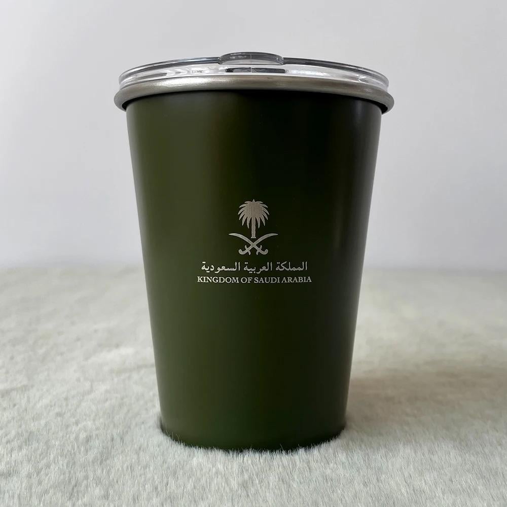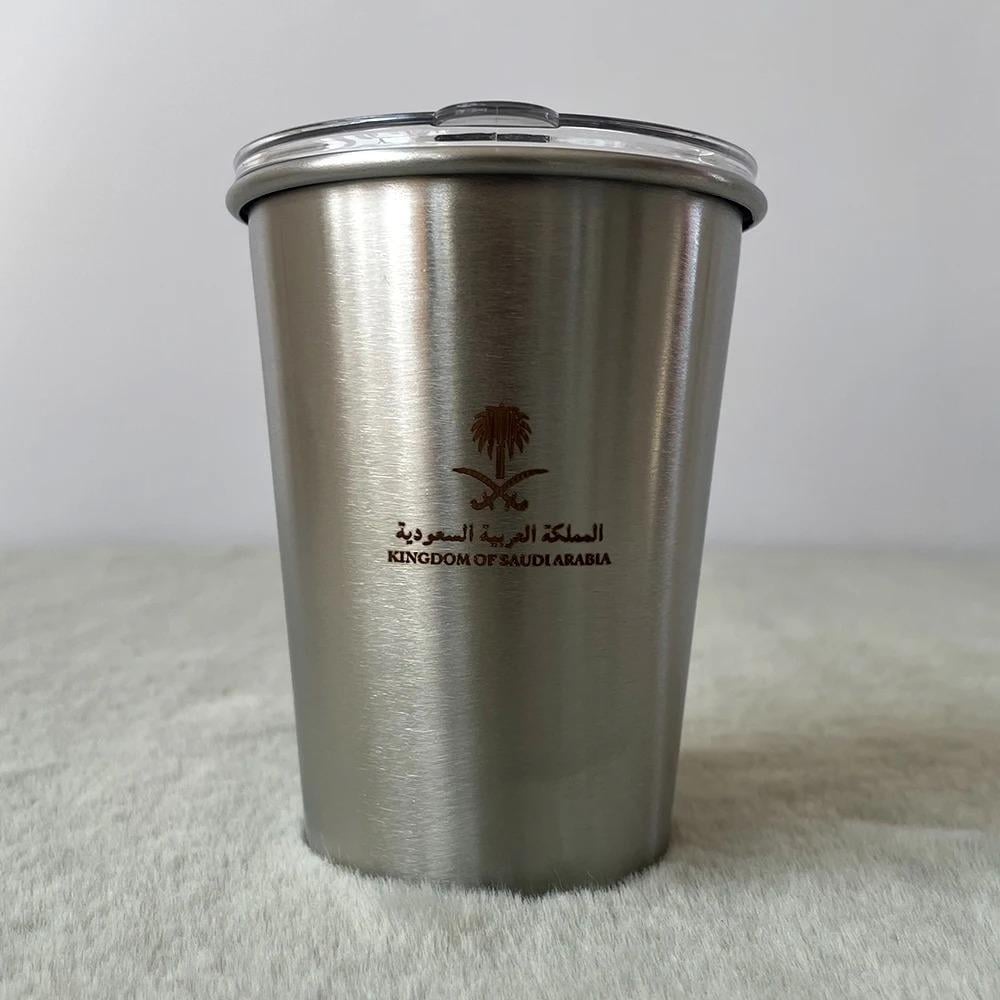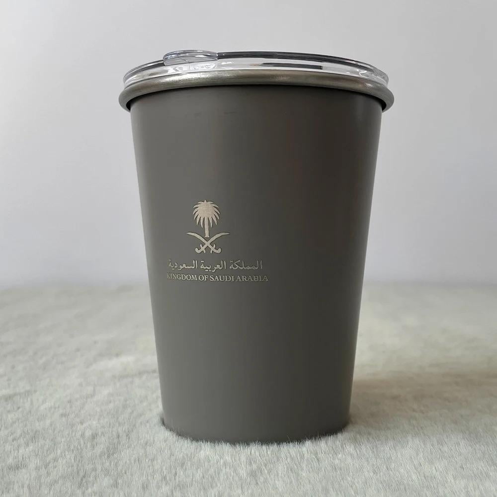 كوب المملكة بسعة 345 مللي مصنوع من الفولاذ المقاوم للصدأ، متوفر بمجموعة ألوان أنيقة تشمل الرمادي، الأحمر الوردي، الفضي، كاكي، الأبيض، الأسود، والأخضر. تصميم متين وعصري يحافظ على حرارة مشروباتك بفعالية.
